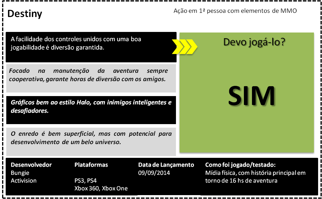 O jogo consiste em uma estrutura de FPS (First Person Shooter) com varios recursos de MMO visando totalmente em campanhas coop on line. Muito do que se percebe nos primeiros 20 minutos de jogo é que ele é “uma copia barata de Halo” mas isso Destiny vai além, sua características de combate são similares a Halo, algo que todos adoram, armas potentes personagens com roupas e poderes característicos e inimigos rápidos, fortes e inteligentes. Destiny em seu primeiro momento nos apresente um enredo simples mas amplo, com potencial para ser muito bem explorado e desenvolvido, podendo enriquecer o futuro do game, mas ai esta seu potencial e também seu maior vilão. Com este enredo ainda raso, não colocando o jogador em uma situação mais emergente pode enfraquecer sua continuidade, aplicando na desistência de joga-lo.
