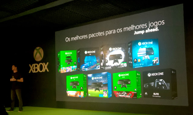 Inicialmente, Willen Puccinelli sobe ao palco para anunciar que os bundles Xbox também estarão nas lojas brasileiras e serão fabricados aqui.