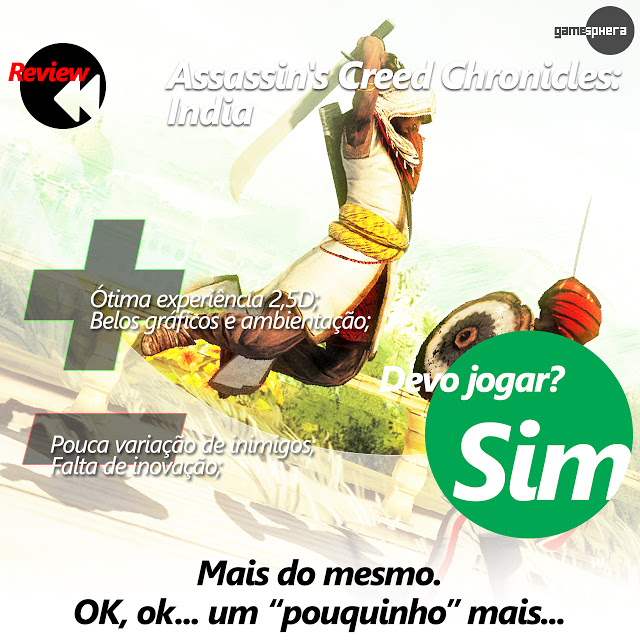 Assassins Creed Chronicles: Índia não é um conjunto muito diferente em comparação ao seu antecessor – ACC: China. Não que seja ruim, já ACC: China é um bom jogo, mas traz consigo menos novidades ao estilo 2,5D, entretanto a experiência principal é melhorada devido a alguns ajustes na jogabilidade, bem como a adição do modo Desafio acima mencionado.