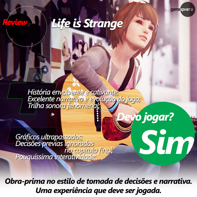 Embora Life is Strange apresente algumas falhas, sua história é uma obra-prima e envolve o jogador do inicio ao fim. Sem dúvida, estipulou um marco nesse tipo de jogo. Caso não tenha jogado ainda, e curte jogos de tomadas de decisões (tipo os da TellTale) e busca por uma história envolvente, sugiro que dê uma chance a Life is Strange!