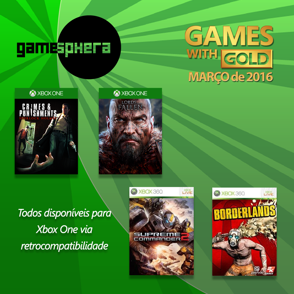 Como de costume, assinantes Xbox Live recebem quatro jogos gratuitos no mês de março. Dois para Xbox One e outros dois para Xbox 360, lembrando que os jogos do X360 são compatíveis com o Xbox One. Neste mês, destaque para Lords of Fallen e Borderlands. Veja abaixo trailers e link para a loja.